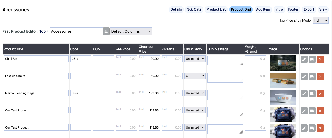 This mode will list the properties for all products in a grid allowing you to set the stock amount via the QTY IN STOCK dropdowns. By default the grid list shows a set of default options but you can change theses if needed via the DEFAULT COLUMNS dropdown.
