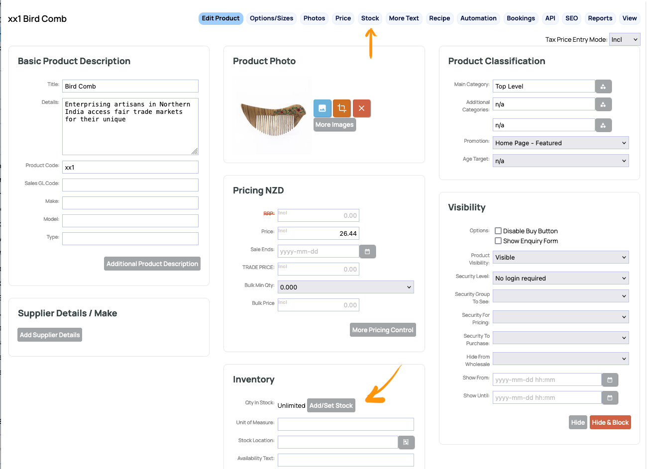 Look for the STOCK tab at the top of the screen, or the ADD / SET STOCK option in the Inventory section on the Product detail screen.